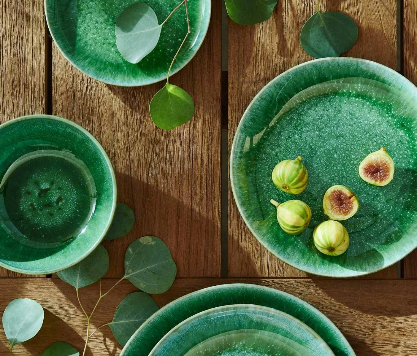 Reactive emerald glaze, speckled in white, gives our Eloise galactic depth. This handmade stoneware collection fills the table with free-spirited elegance.