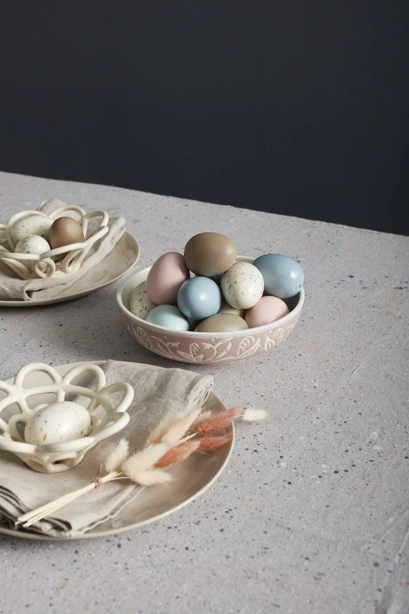 Sprinkle a few playful sayings into your Easter decor with the Spritz Egg Collection. These matte white ceramic eggs feature simple text stamped into clay & coordinate with the splatter & pastel Spritz Eggs to create a charming spring scene.