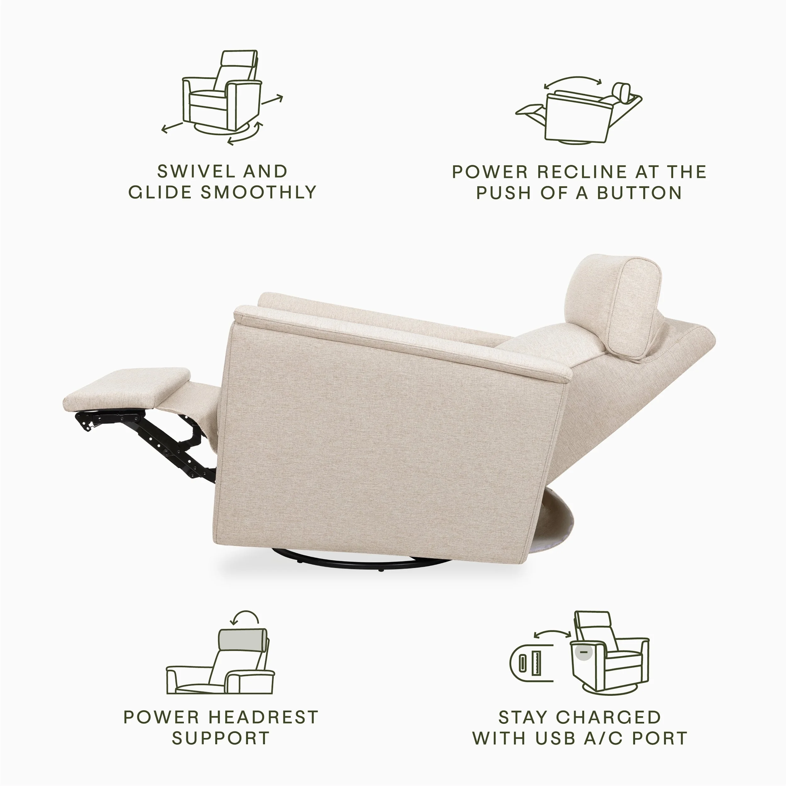 A deluxe, electronic version of our best-selling Willa Recliner. With thoughtful details and clean lines, the Willa Plus Power Recliner w/ Adjustable Power Headrest combines modern design with traditional comfort. Its pillow lined arms, smooth glide, and power recline + power headrest creates the most comfortable and luxurious resting spot for you and your baby.