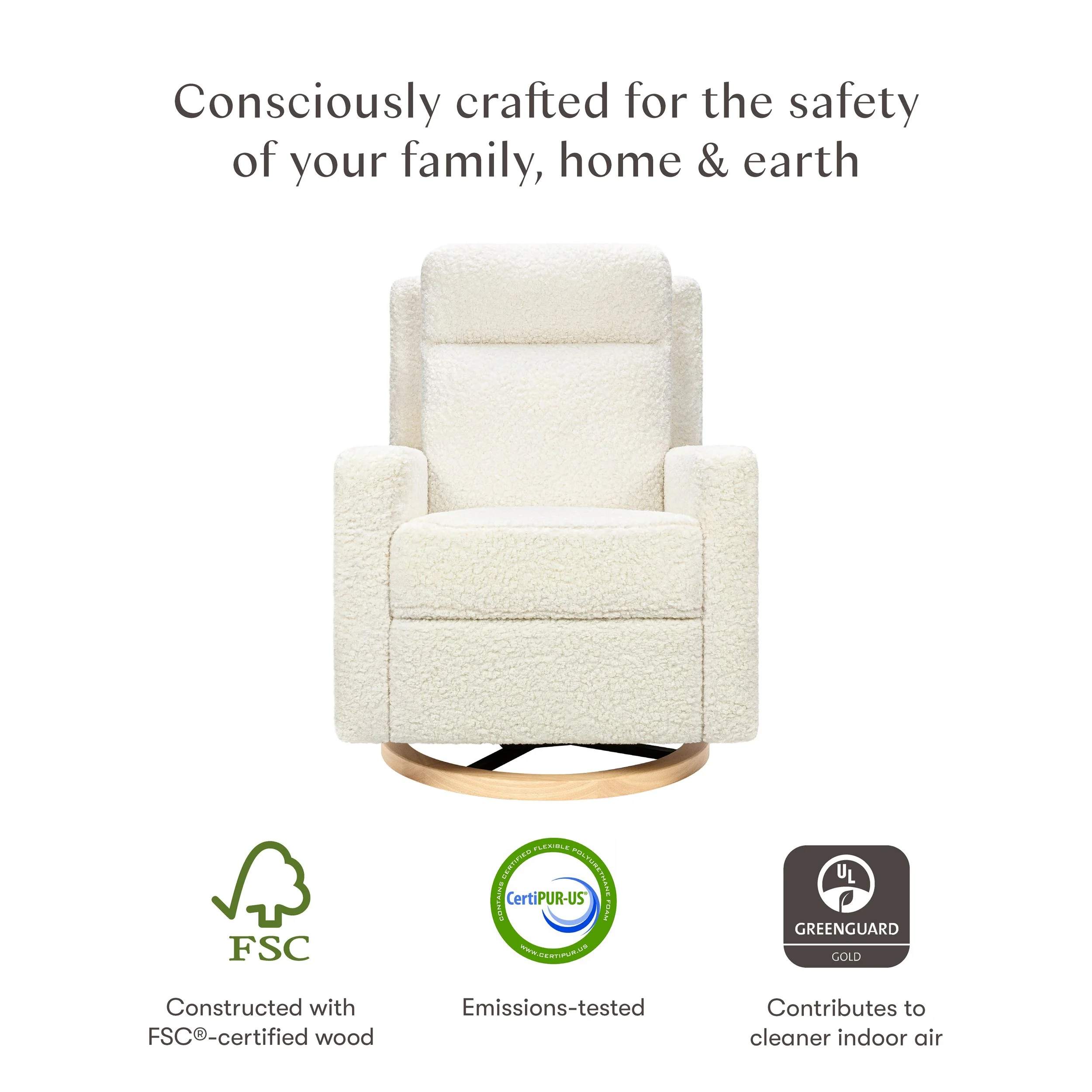 The Sigi Pro Power Recliner takes nursery comfort to the next level with its sleek, modern design and advanced power features. Effortlessly customize your comfort at the touch of a button with power recline, an adjustable power headrest, and tailored power lumbar support. The 270-degree swivel allows for easy movement, while the built-in underlight with adjustable brightness provides a gentle glow for nighttime feeds. Upholstered by hand in durable, high pile fabrics and featuring a sophisticated wood base, it's a premium, GREENGUARD Gold certified choice for a healthy and stylish home.