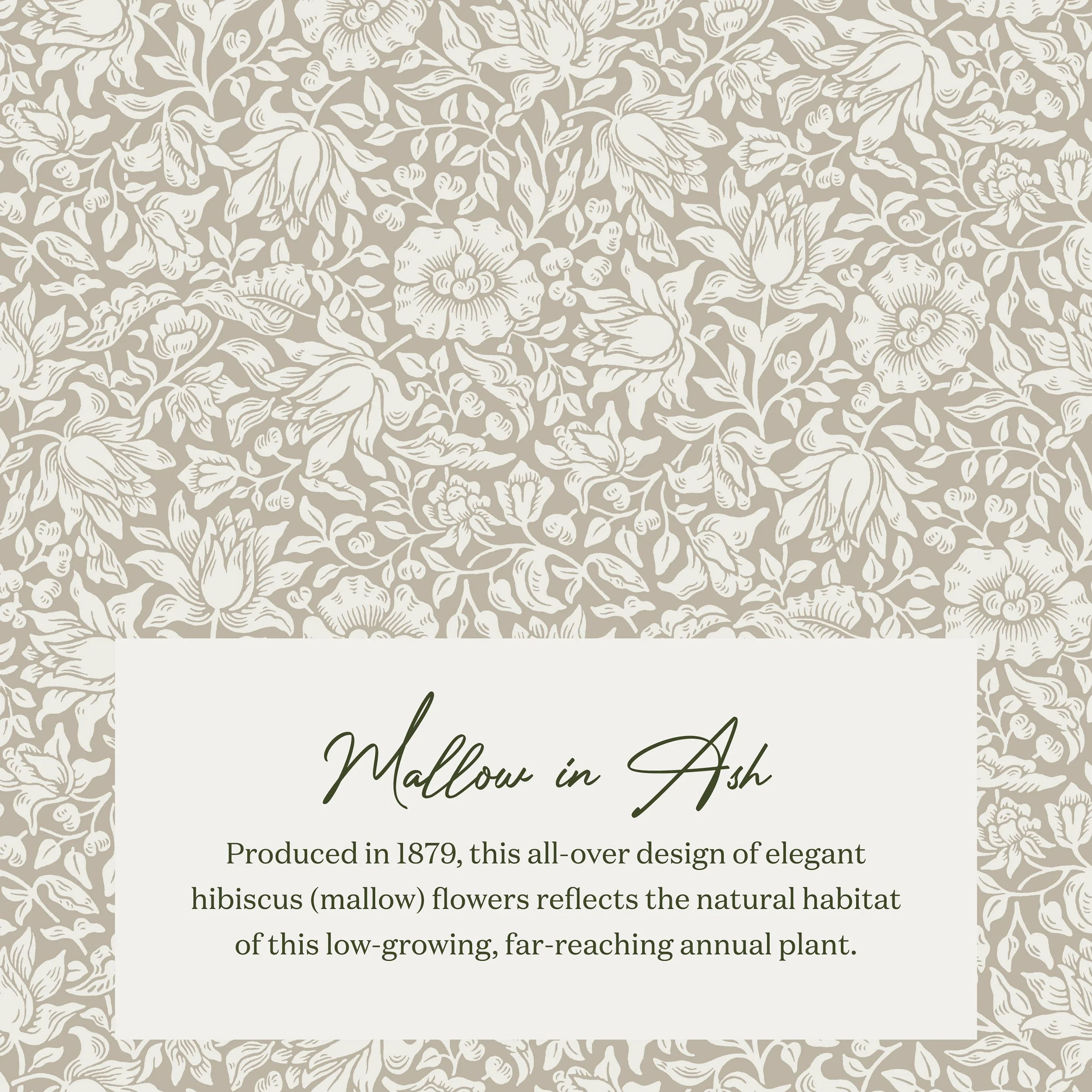 ABOUT THE DESIGN: Produced in 1879, this all-over design of elegant hibiscus (mallow) flowers reflects the natural habitat of this low-growing, far-reaching annual plant.