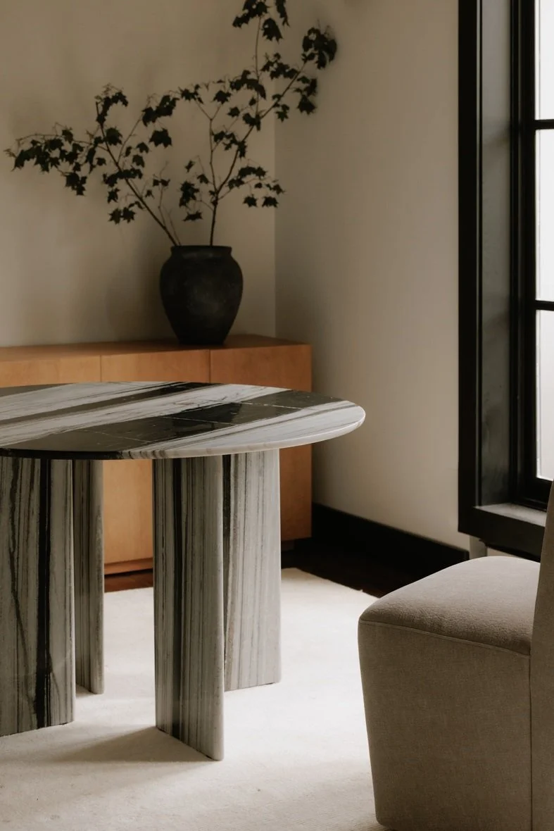 The Lucile round dining table effortlessly combines contemporary flair with a timeless silhouette. The table's allure is further enhanced by expressive green onyx panda marble, adding a touch of artistry and opulence. The smooth and organic textures on the marble beautifully contrast with the table's geometric base, creating an intriguing visual harmony and exuding an undeniable sense of elegance and versatility.