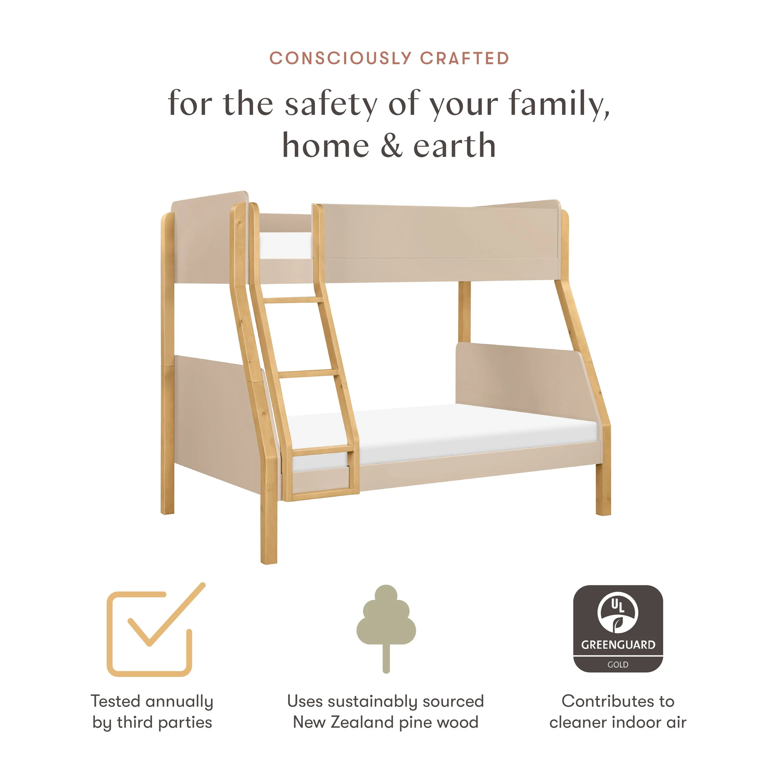 GREENGUARD GOLD CERTIFIED: This bunk bed has been tested for over 10,000 chemical emissions and VOCs, undergoing rigorous scientific testing to meet some of the world’s most stringent chemical emissions requirements. It contributes to cleaner indoor air, creating a healthier environment for your baby to sleep, play, and grow.