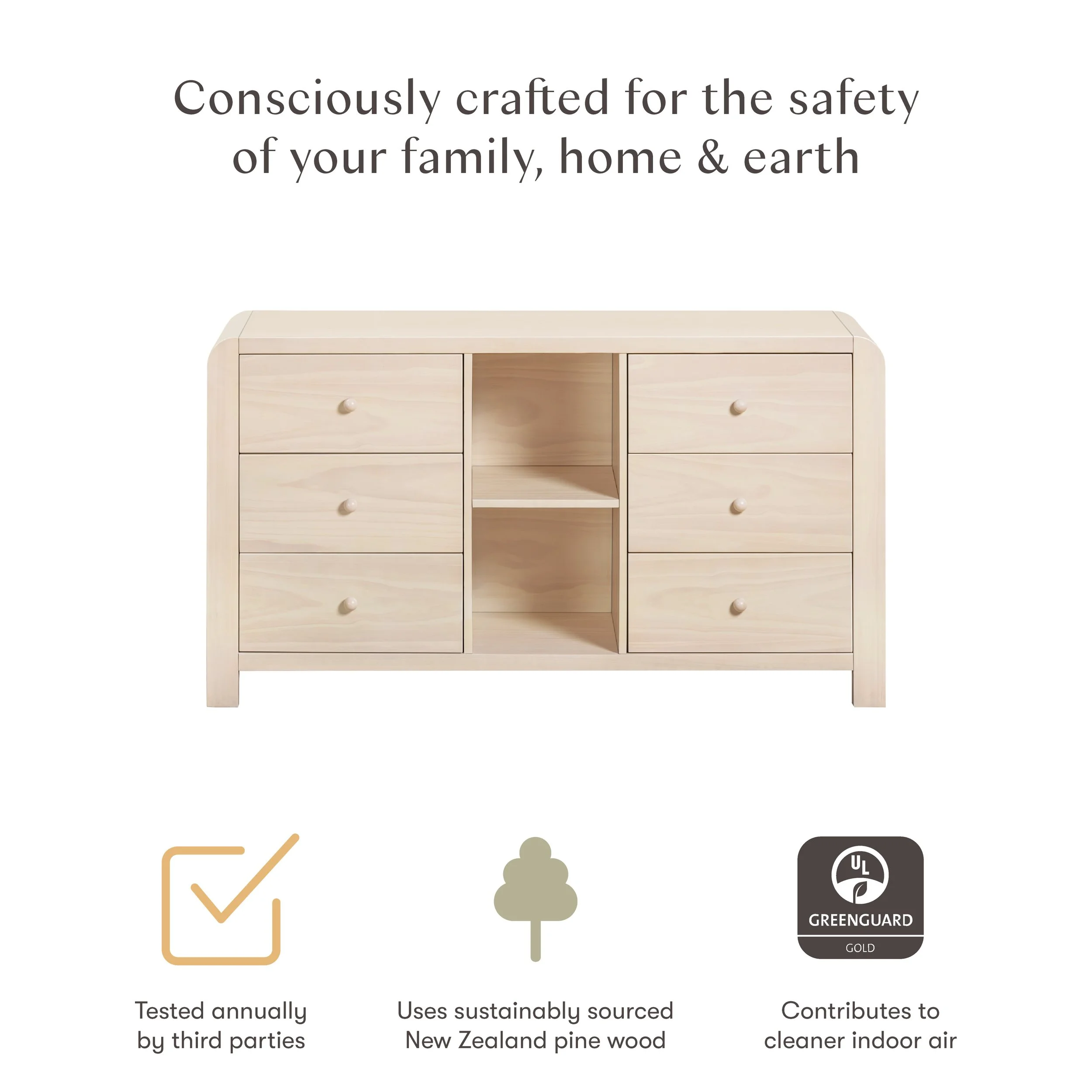GREENGUARD GOLD CERTIFIED: This dresser is tested for over 10,000 chemical emissions and VOCs, undergoing rigorous scientific testing to meet some of the world's most stringent chemical emissions requirements. It contributes to cleaner indoor air, creating a healthier environment for your kiddo to sleep, play, and grow.